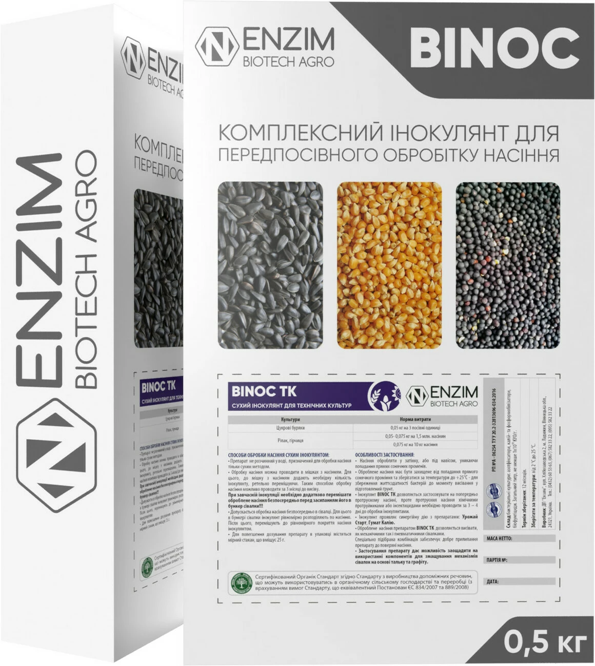 BiNoc ТК ENZIM Agro - комплексный сухой инокулянт для семян пропашных культур (кукурузы, подсолнечника, сорго, сахарной свеклы, рапса) на основе талько-графитной смеси, высокоэффективный инокулянт для технических культур.