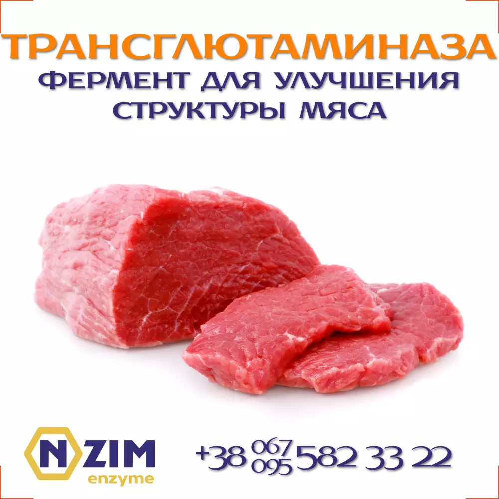 Трансглютаминаза ENZIM - органический катализатор химических реакций, связывает белковые молекулы, образуя новые связи между аминокислотами, тем самым стабилизируя структуру белка. Трансглютаминаза усиливает важные функционально-технологические характеристики протеинов, благодаря своей способности катализировать внутри- и межмолекулярное перекрёстное сшивание белковых молекул, что позитивно влияет на текстуру продукта.
